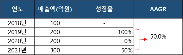연평균성장률(AAGR) : 다년도의 변화를 파악하기 위해 1년 동안의 성장률을 산술평균을 한 것을 의미함