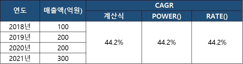 AAGR값(50%)과 CAGR값(44.2%)이 다른 것을 확인할 수 있죠?