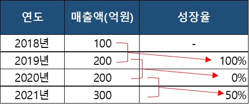 성장률 : 1년 동안(전년도 대비 올해)의 성장 부분을 비율로 나타낸 수치