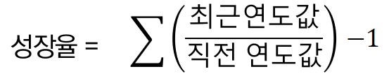 연평균복합성장률(CAGR) : 다년도의 변화를 파악하기 위해 시작시점과 종료시점간 성장률을 기하평균한 것을 의미함