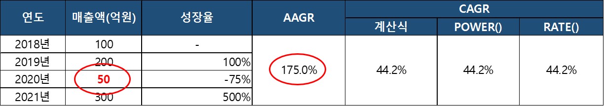 만약, 2019년 매출액이 50억으로 감소했다면 AAGR을 175%로 급격하게 커지는 것을 볼 수 있죠?