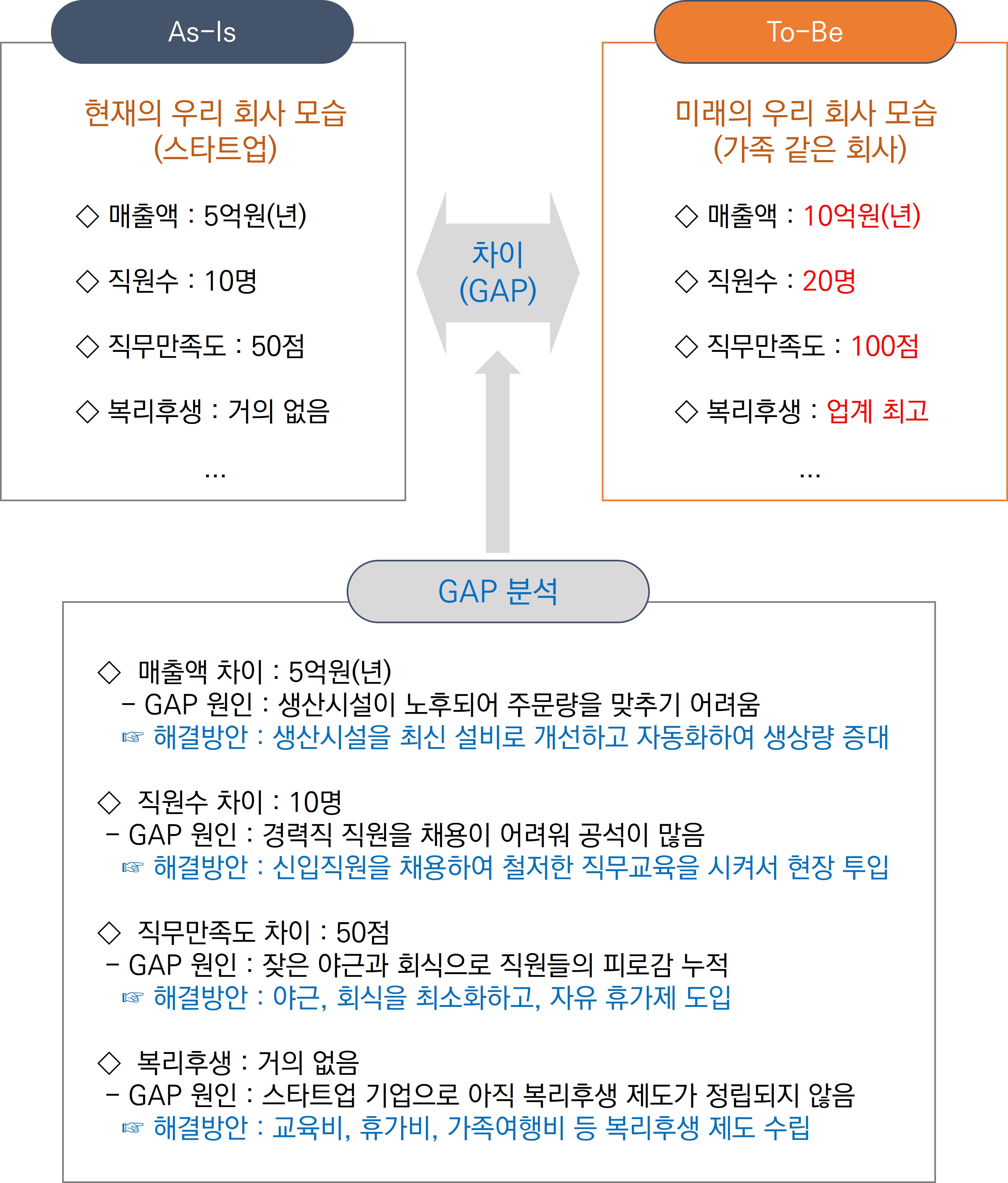 즉, 갭(GAP)을 분석해서 As-Is 상태를 To-Be 상태로 만들기 위해 노력하는 것입니다.