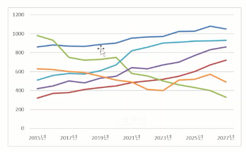 정답은 없지만 제 오랜 보고서, 기획서 작성 경험으로만 본다면 그래프에 적정한 선 색상은 4개 이하입니다.