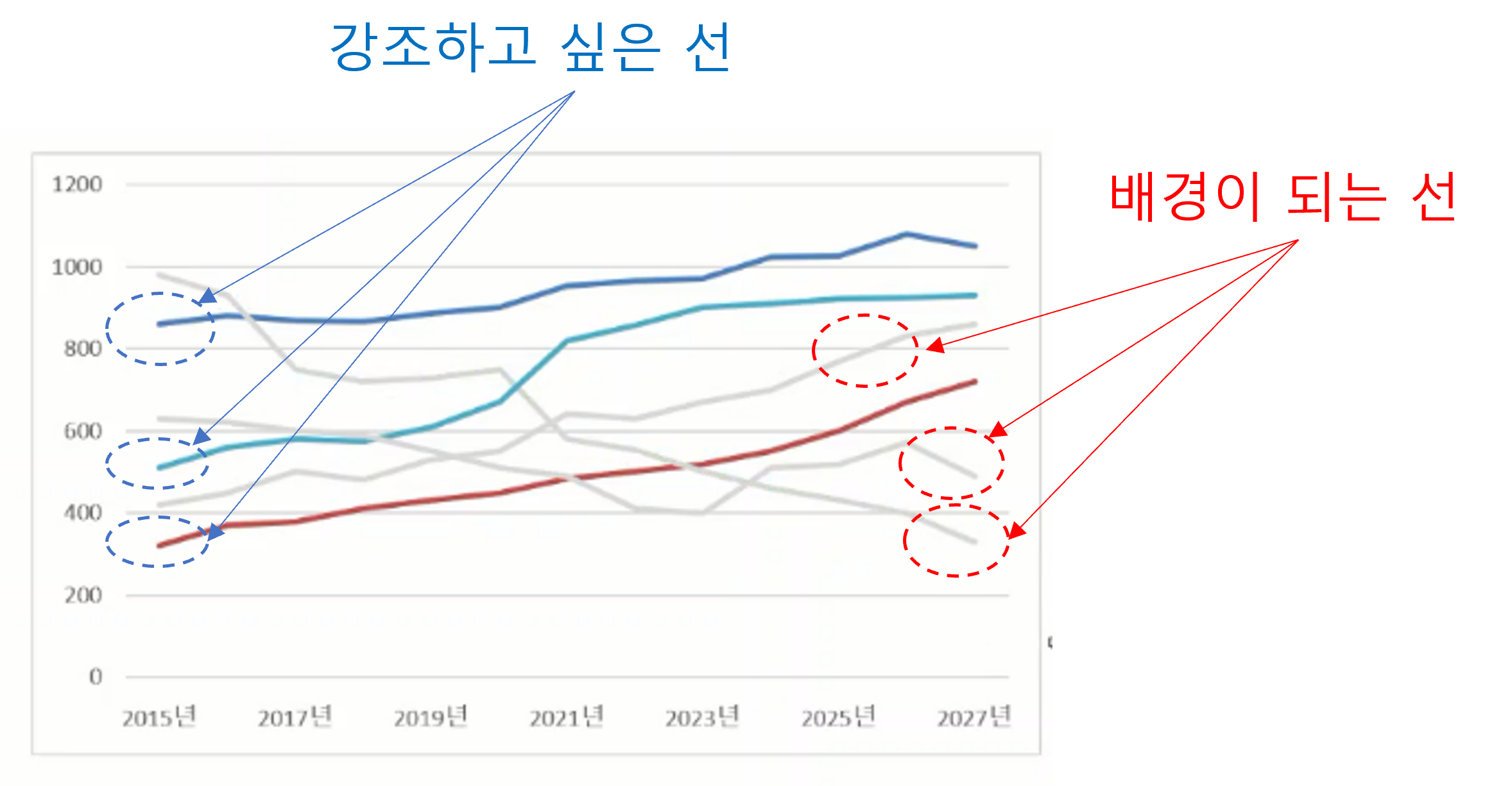 생각해보면 이 그래프를 보는 독자(상사 등)가 중요하게 여기는 선은 많아야 2~3개 정도입니다.