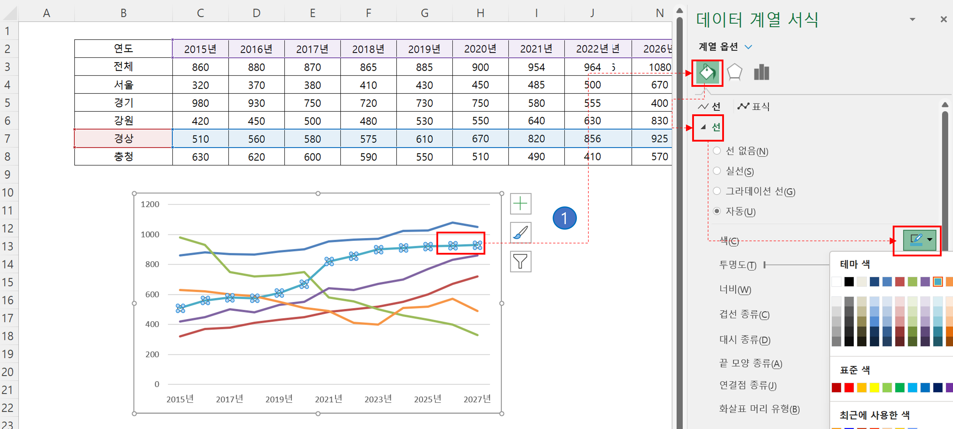 ① 그래프에서 바꾸고 싶은 선을 선택하고 [마우스 우클릭] → [데이터 계열 서식]을 선택합니다. 그러면 오른쪽에 창이 하나 뜨는데 여기서 [채우기 및 선] → [선] → [색]에서 툴 박스를 선택하면 다양한 선이 나오게 됩니다.