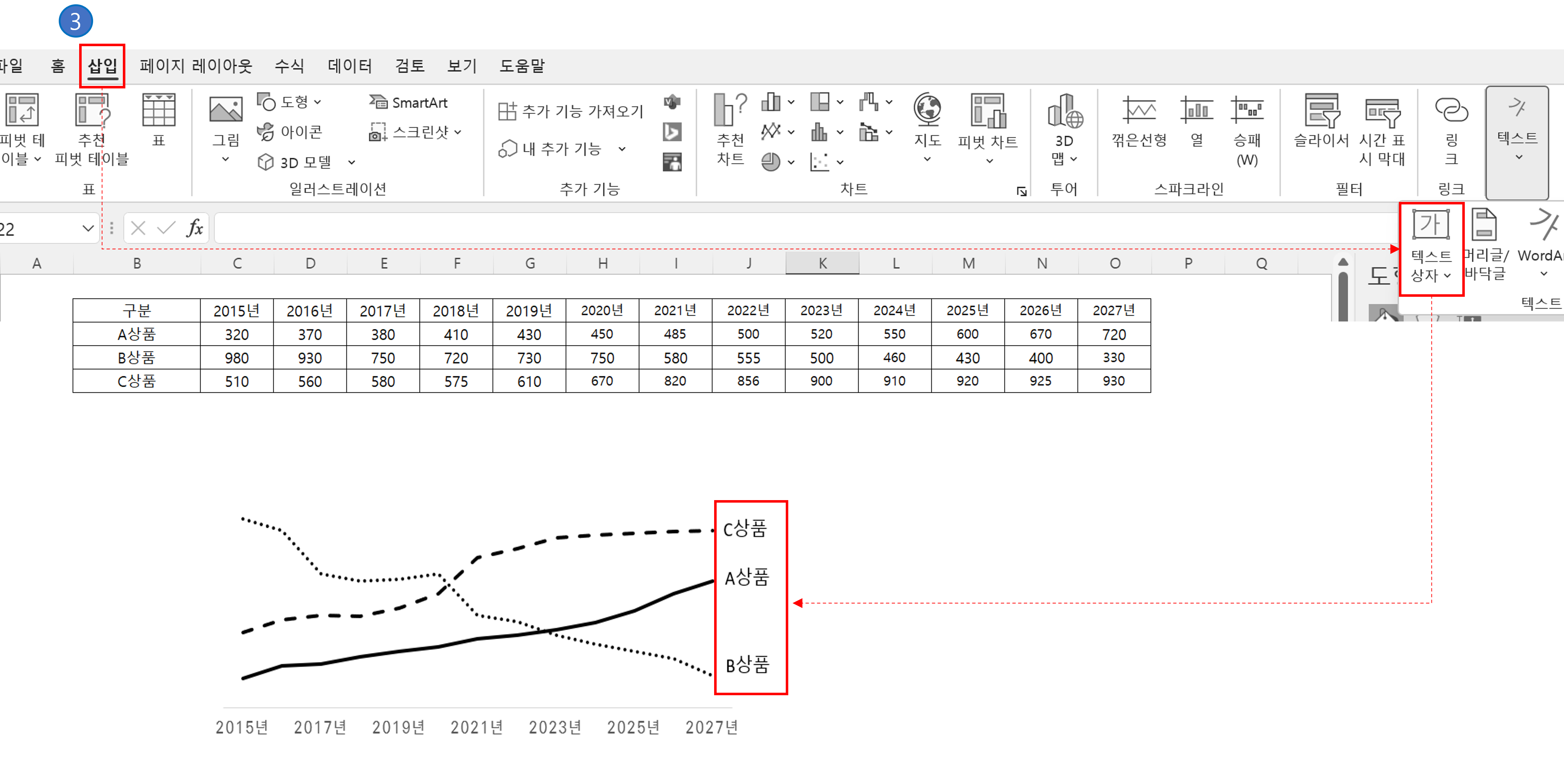 ③ 그래프 기능에서 범례를 없애고 [메뉴]에서 [텍스트 상자]를 선택하여 선 오른쪽에 별도로 만들어 줘야합니다.