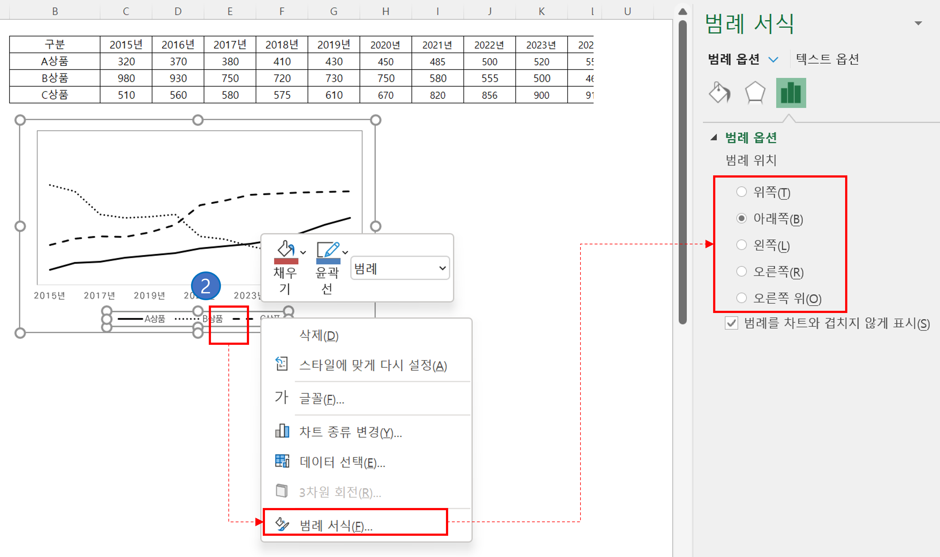 ② 범례를 선택하고 마우스 우클릭합니다. 이때 [범례 서식]을 선택하면 오른쪽에 [범례 위치]에서 내가 원하는 위치에 범례를 배치시키면 됩니다.