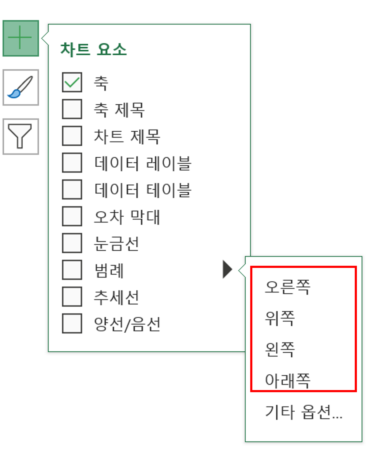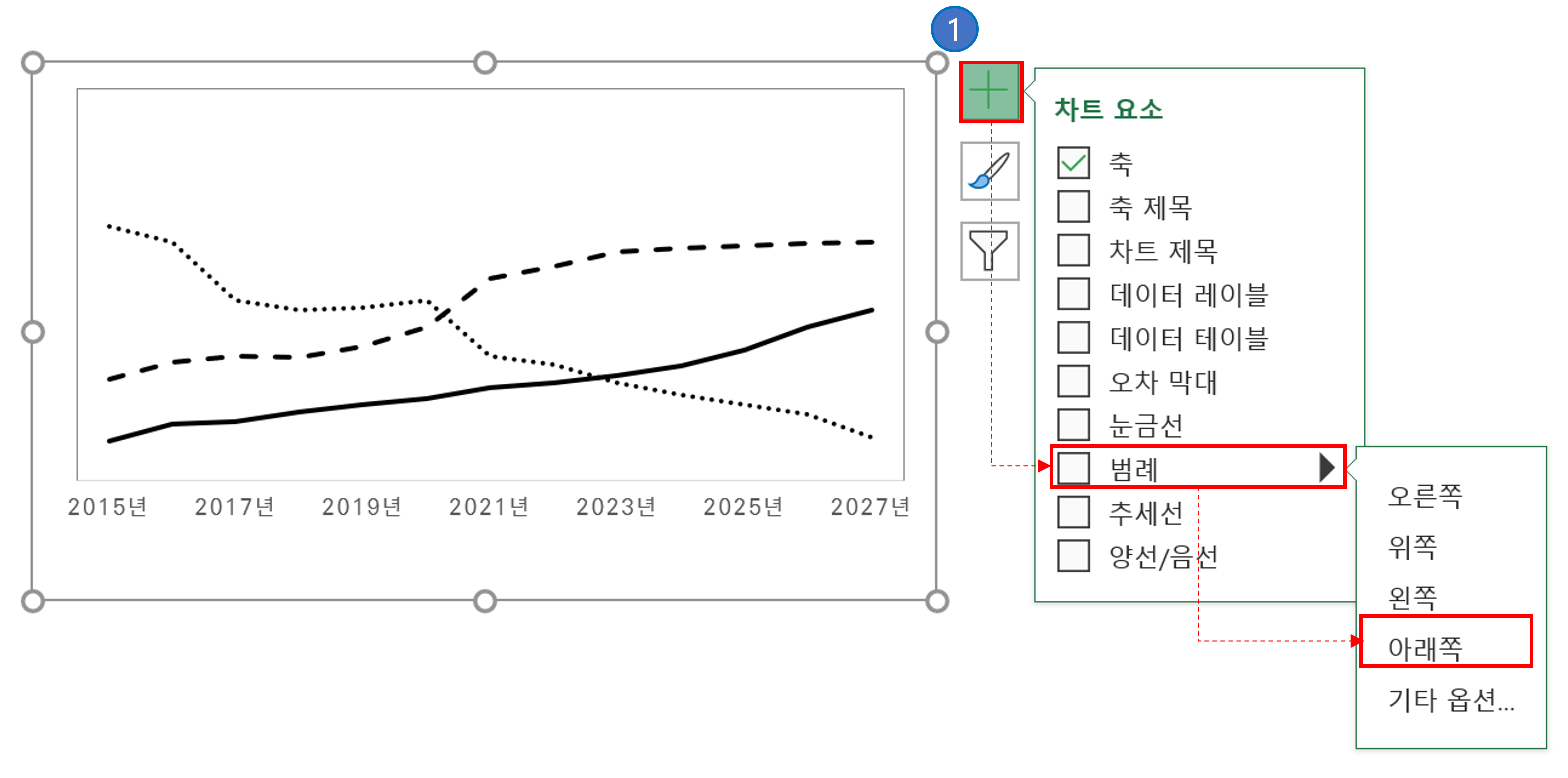 ① 범례를 만드는 방법은 매우 간단한데요. 가장 쉬운 방법이 그래프를 선택하면 오른쪽 상단에 나오는 + 버튼을 누르고, [범례] 중에서 원하는 위치에 만들어주면 됩니다.