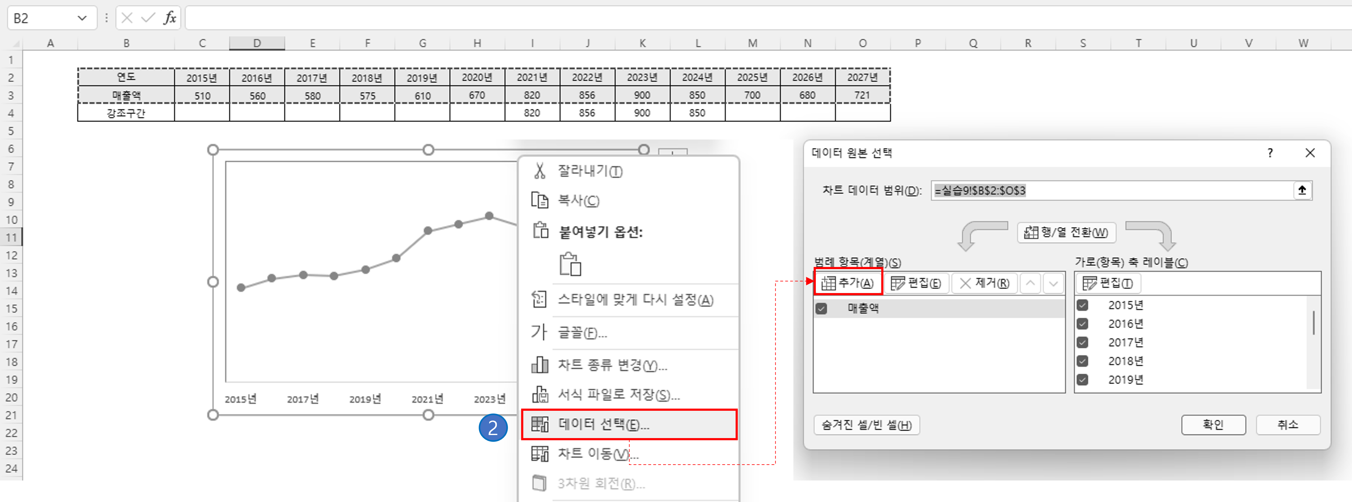 ② 선 그래프를 선택하고 [마우스] 우클릭을 하면 창이 하나 뜨는데요. 여기서 [데이터 선택] → [추가] 버튼을 선택합니다.