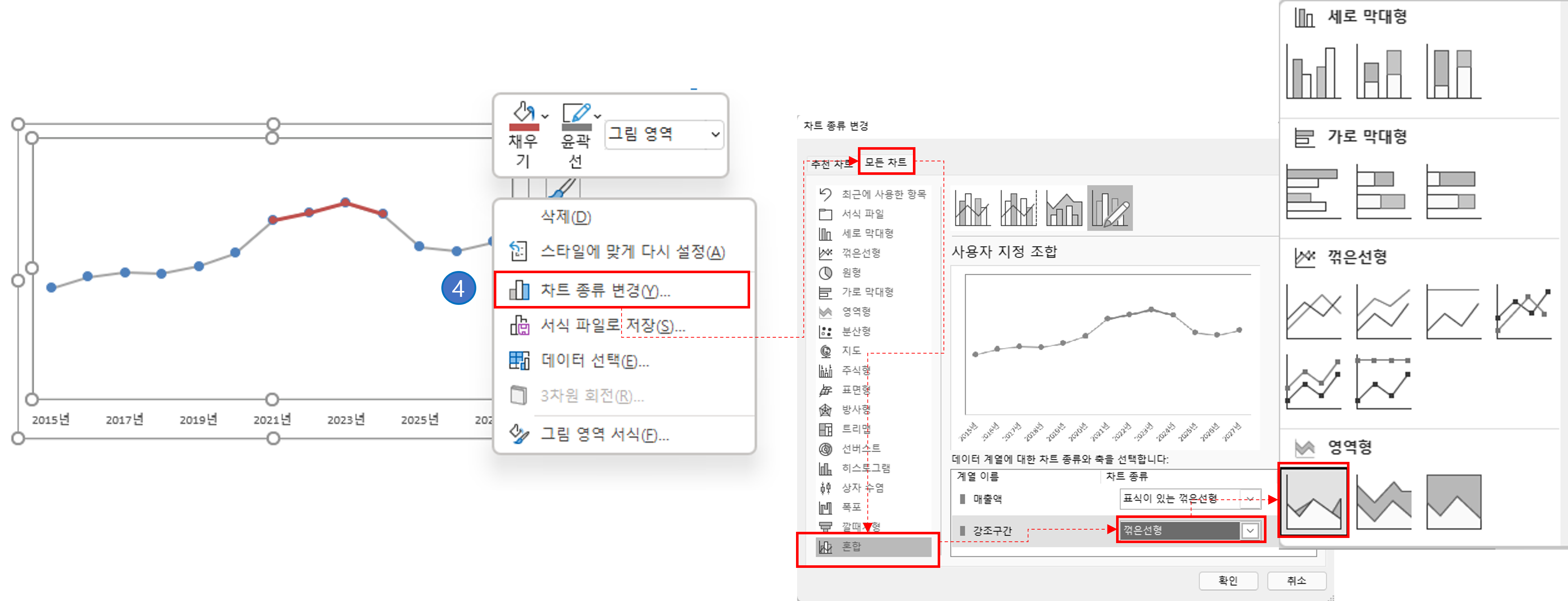 ④ 이제 영역형태로 만들어 줘야 합니다. 다시 한번 그래프를 선택하고 [마우스] 우클릭 → [차트 종류 변경] → [모든 차트] → [혼합]을 선택합니다.