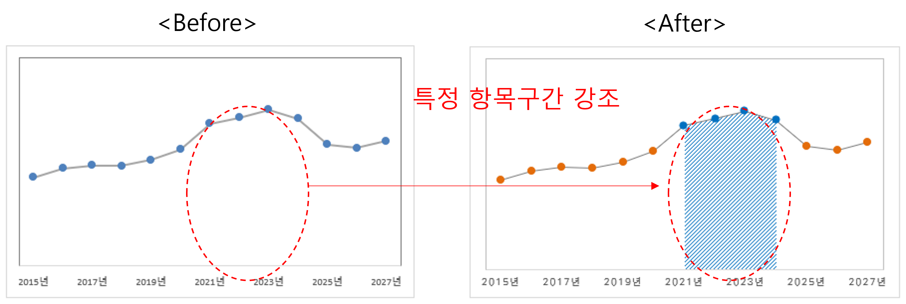 선그래프에서 특정한 연도나 항목을 <After>처럼 색상을 입히는 거죠. 이렇게 하면 독자에 눈에 쉽게 들어갈 겁니다.