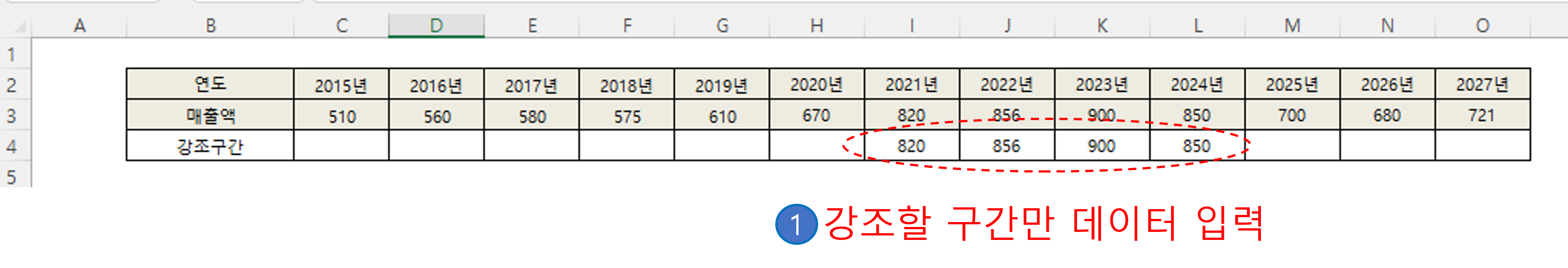 ① 우선, 강조할 구간의 행을 하나 만듭니다. 아래 그림을 보시면 강조할 구간만 동일한 데이터로 만들어 줍니다.