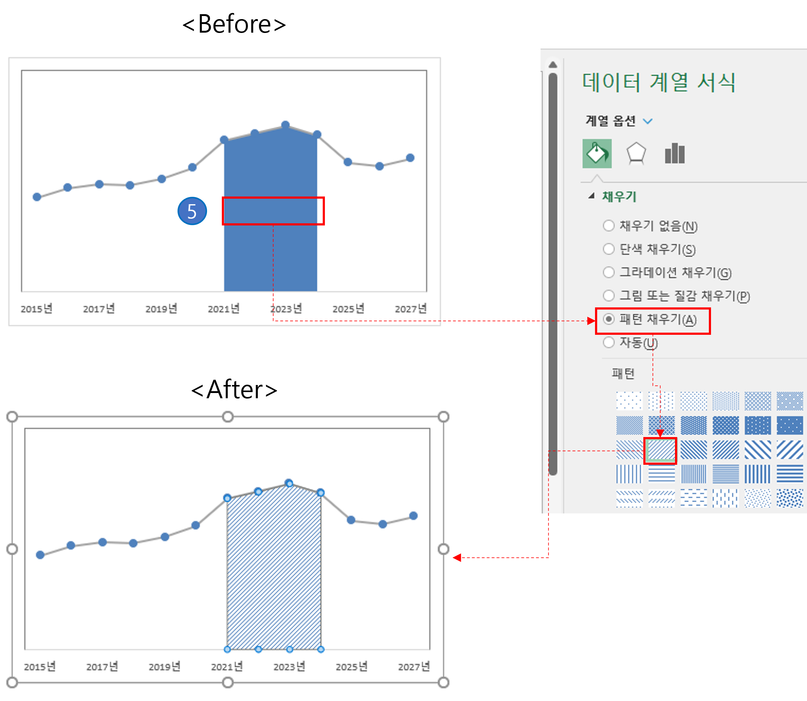 ⑤ 이제 영역의 색상을 바꿔주면 되겠죠. 영역을 선택하고 [데이터 계열 서식]에서 [패턴 채우기]로 바꿔주기만 하면 됩니다. 원하는 색상이 있으면 이것도 변경이 가능합니다.