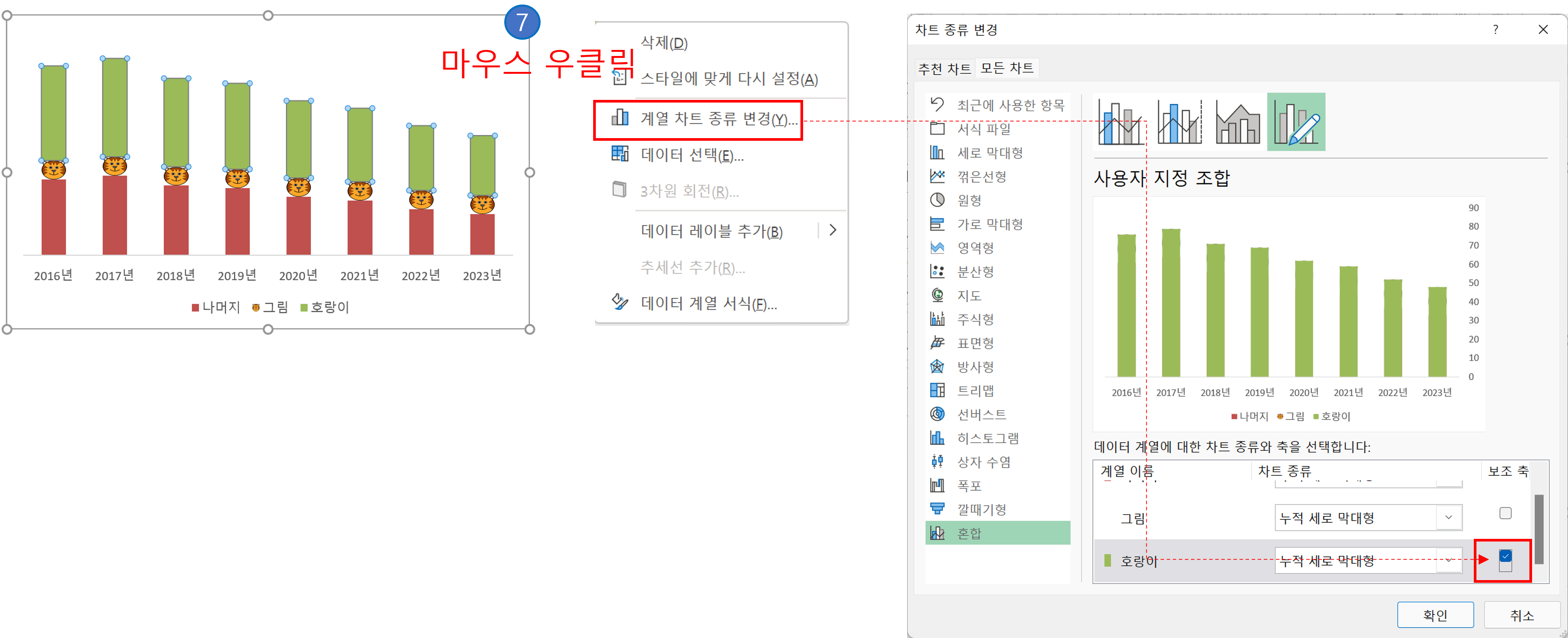 ⑦ 추가로 만들어진 막대를 숨겨줘야하는데요. 이때 사용하는 방식이 혼합 차트입니다. 우선, 그래프를 선택하여 마우스 우클릭 → 계열 차트 종류 변경 → 원본 데이터 오른쪽에 보조축을 선택합니다.