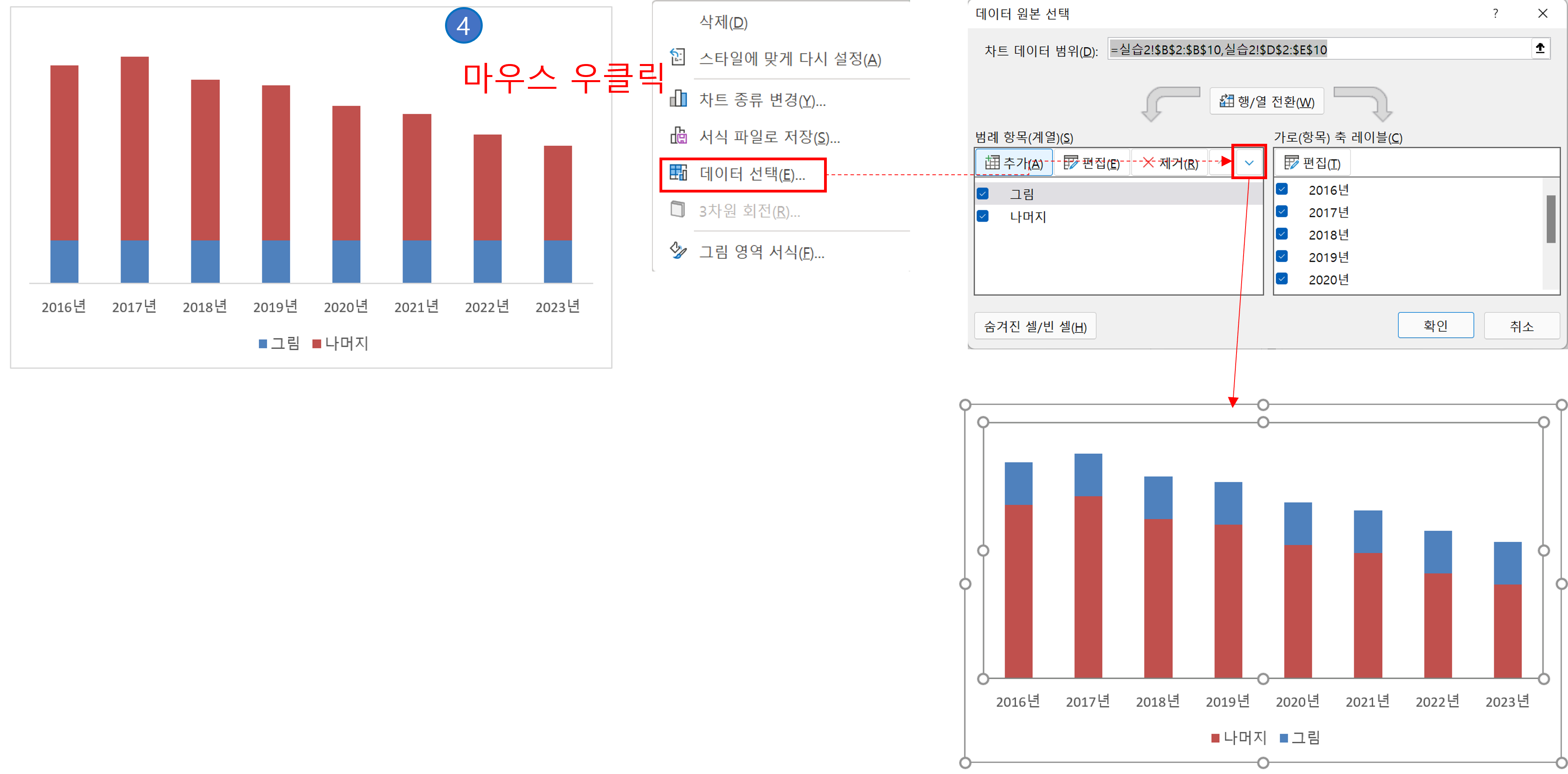 ⑥ 원본데이터로 막대를 추가해 줍니다. 이때는 데이터 선택에서 범례 항목을 추가해주면 됩니다.