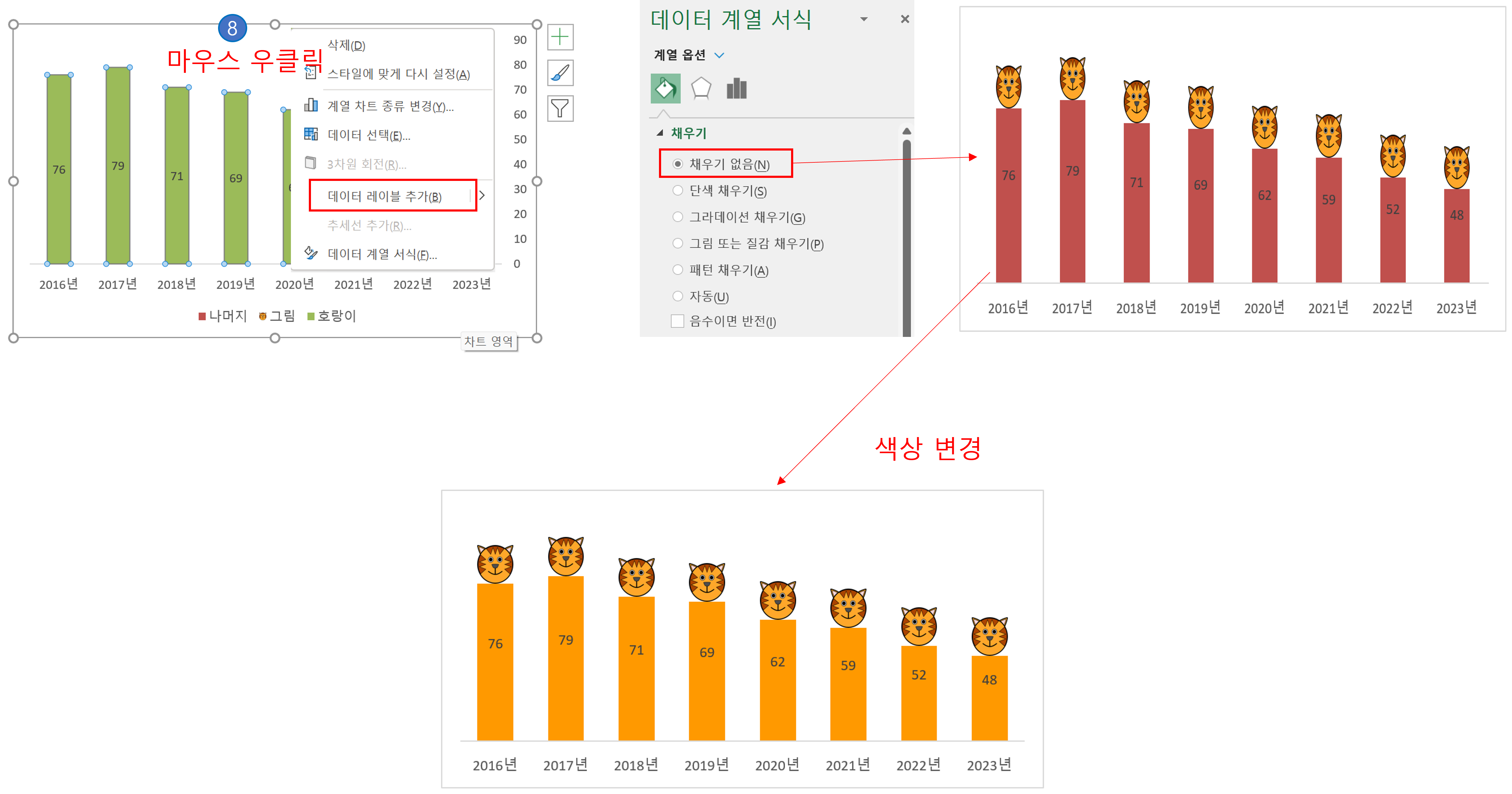 ⑧ 이제 막대를 숨겨주면 되는데요. 원본데이터 막대를 선택해서 채우기 없음을 해주면 됩니다. 그리고, 작성자가 원하는 색상으로 바꿔주면 되겠죠^^