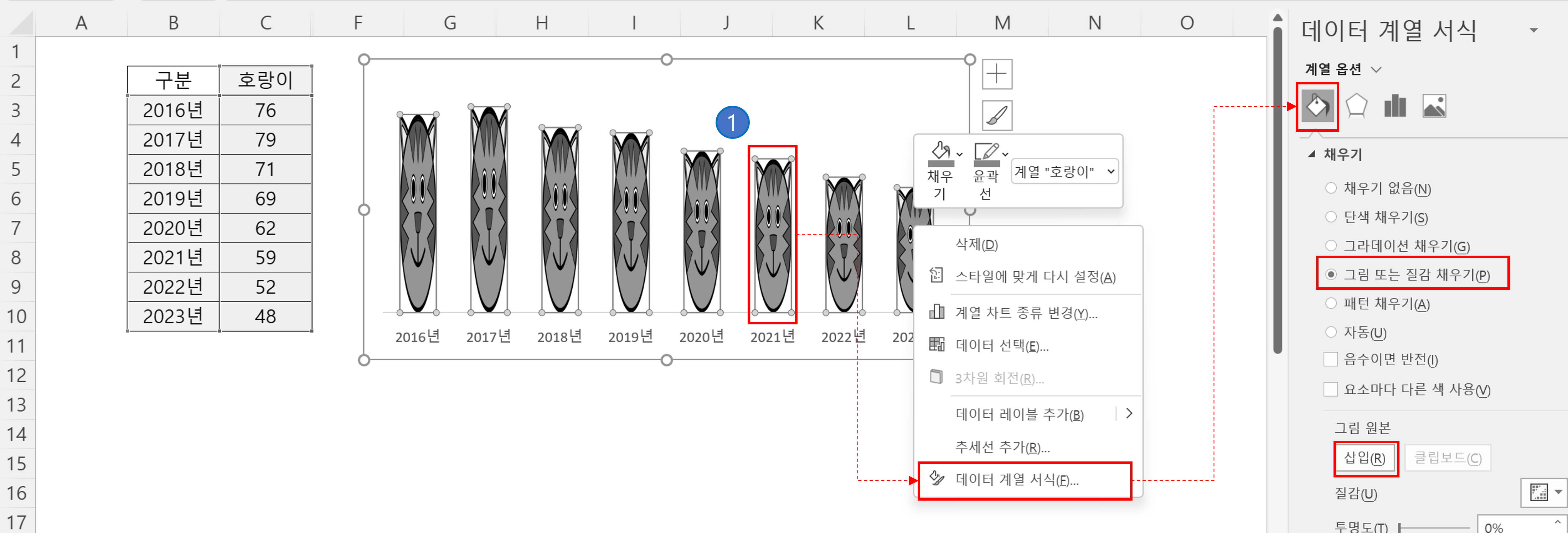 ① 우선, 막대에 이미지를 넣는 방법은 막대를 선택하여 [데이터계열서식] → [채우기]에서 그림을 삽입하면 됩니다.