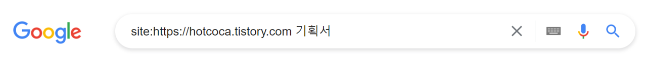 "site:https://hotcoca.tistory.com/ 기획서" 면 이 사이트에서 "기획서"가 들어간 내용만 검색됩니다.