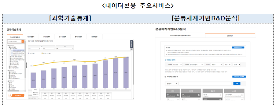 ㅇ 국가 과학기술통계, R&D데이터신청, 분류체계기반R&D분석, 과학데이터활용지원, OpenAPI 등 국가R&D 데이터에 관한 활용데이터를 확인할 수 있음
