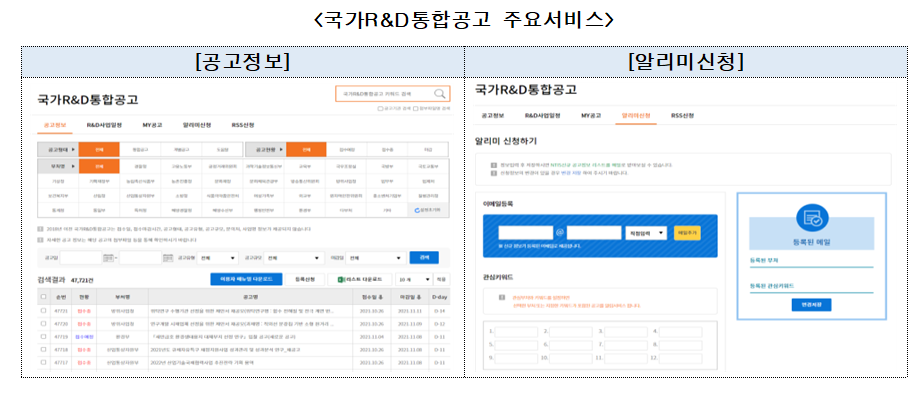 ․ 특히 「알리미신청」메뉴를 통해, 이메일 및 관심키워드 등 정보입력 후 저장하면 NTIS 신규 공고정보 리스트를 이메일로 받아 볼 수 있음(로그인 시 이용가능)
