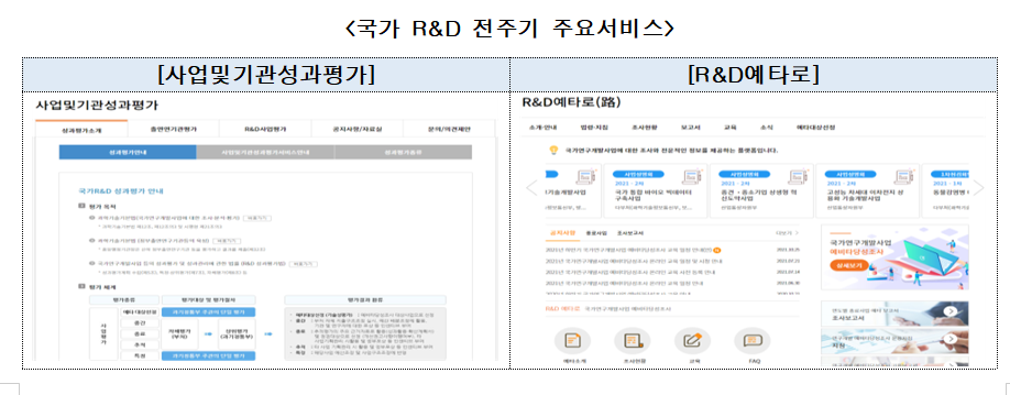 ㅇ 중장기계획/예산/사업, R&D예타로, 사업 및 기관 성과평가, R&D기평가관리 등에 대한 서비스를 제공함