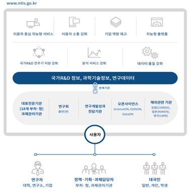 - 부처별(기관별)로 개별 관리되고 있는 국가 R&DR&D 사업 관련 정보와 과학기술 정보를 공유하고 공동 활용해, 국가R&D 투자 효율성을 높이고 연구 생산성 향상에 기여하는 것이 주목적임