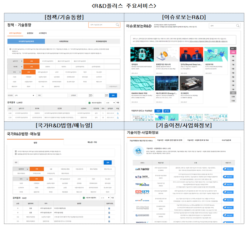 ㅇ 과학기술 정책/기술 동향, 기술이전/사업화정보 및 우수성과, R&D 이슈, R&D법령 및 매뉴얼 등 R&D 추진에 따라 필요한 추가적인 정보들을 제공함