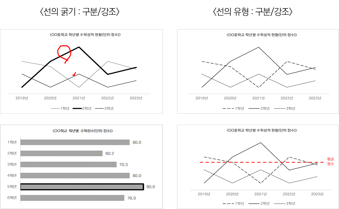 - 차트에서 선은 굵기와 유형에 따라서 그 사용방법이 다름