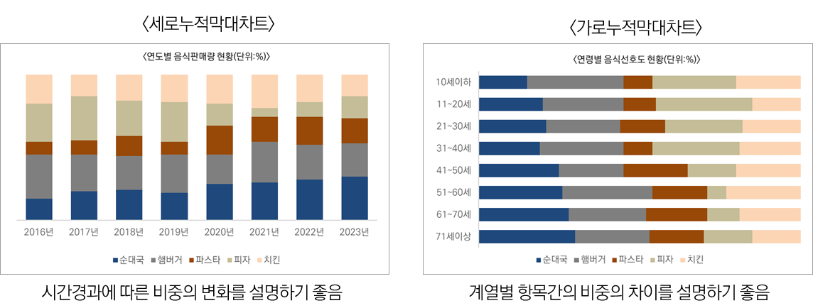 - 세로누적막대차트는 시간 경과에 따른 항목별 비중의 변화를 설명하기 좋음
