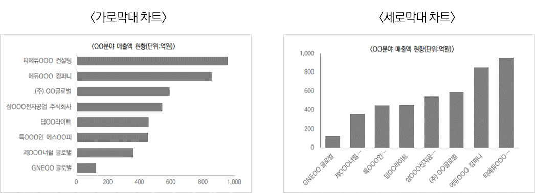 - 항목명이 길어도 전부 표시가 가능하고 막대의 정렬방식이 위에서 아래로 표현되기 때문에 암묵적으로 순위를 암시하고 있음