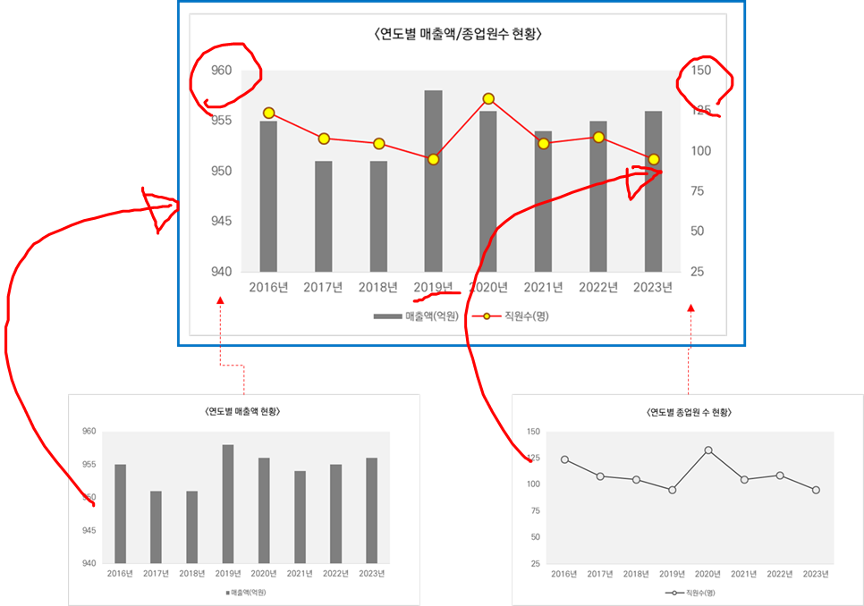 - 아래와 같이 “연도별 매출액 현황” 차트와 “연도별 종업원수 현황”차트를 결합하여 기본축(좌측)에는 매출액, 보조축(우측)에는 종업원수를 넣어서 콤보차트를 만들 수 있음