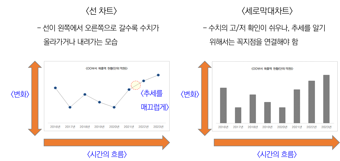But. 세로막대차트는 시간의 흐름(과거→현재, 현재 →미래)을 암시