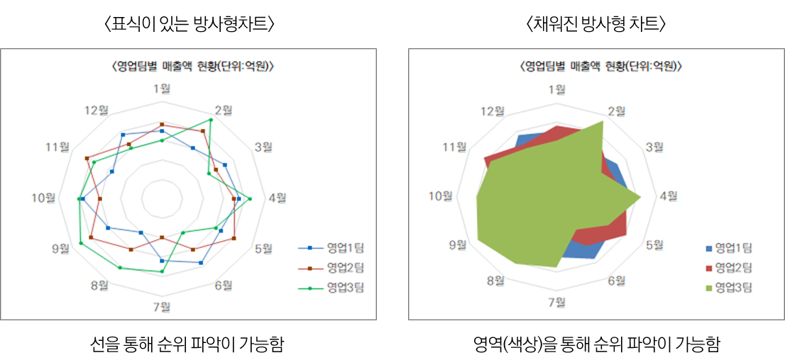 - 표시해야할 항목 수가 너무 많다면 방사형 차트를 사용하는 것이 좋음