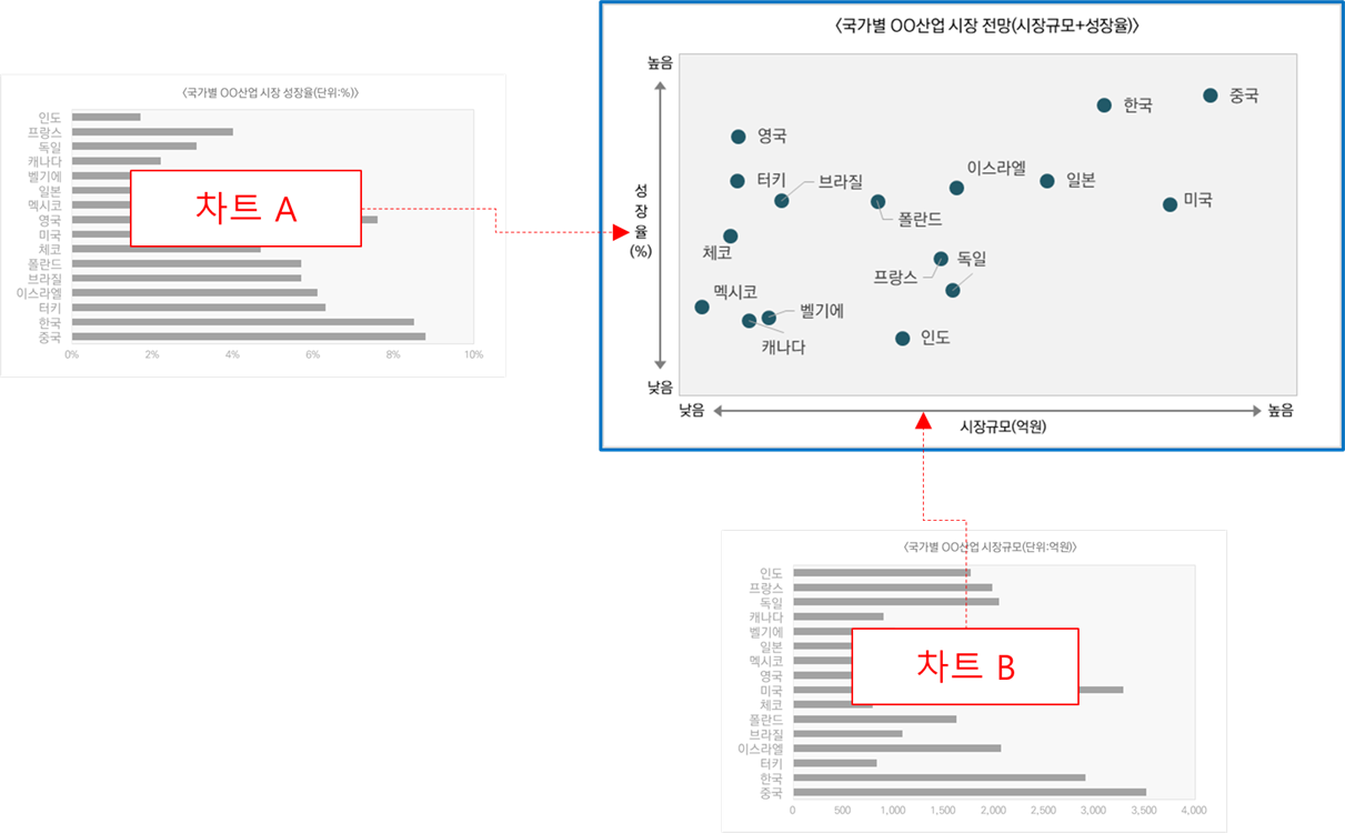 - 분산형 차트의 원리는 X축에는 <차트 A>의 “시장규모”을 배치하고, Y축에는 <차트 B>의 “성장율”을 배치하여 시장규모는 큰데 성장률이 적은 국가를 쉽게 확인이 가능