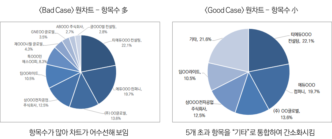 - 원 전체가 100%이고, 항목별 수치(비율)가 전체 중에서 차지하는 비중이라는 것을 쉽게 인지
