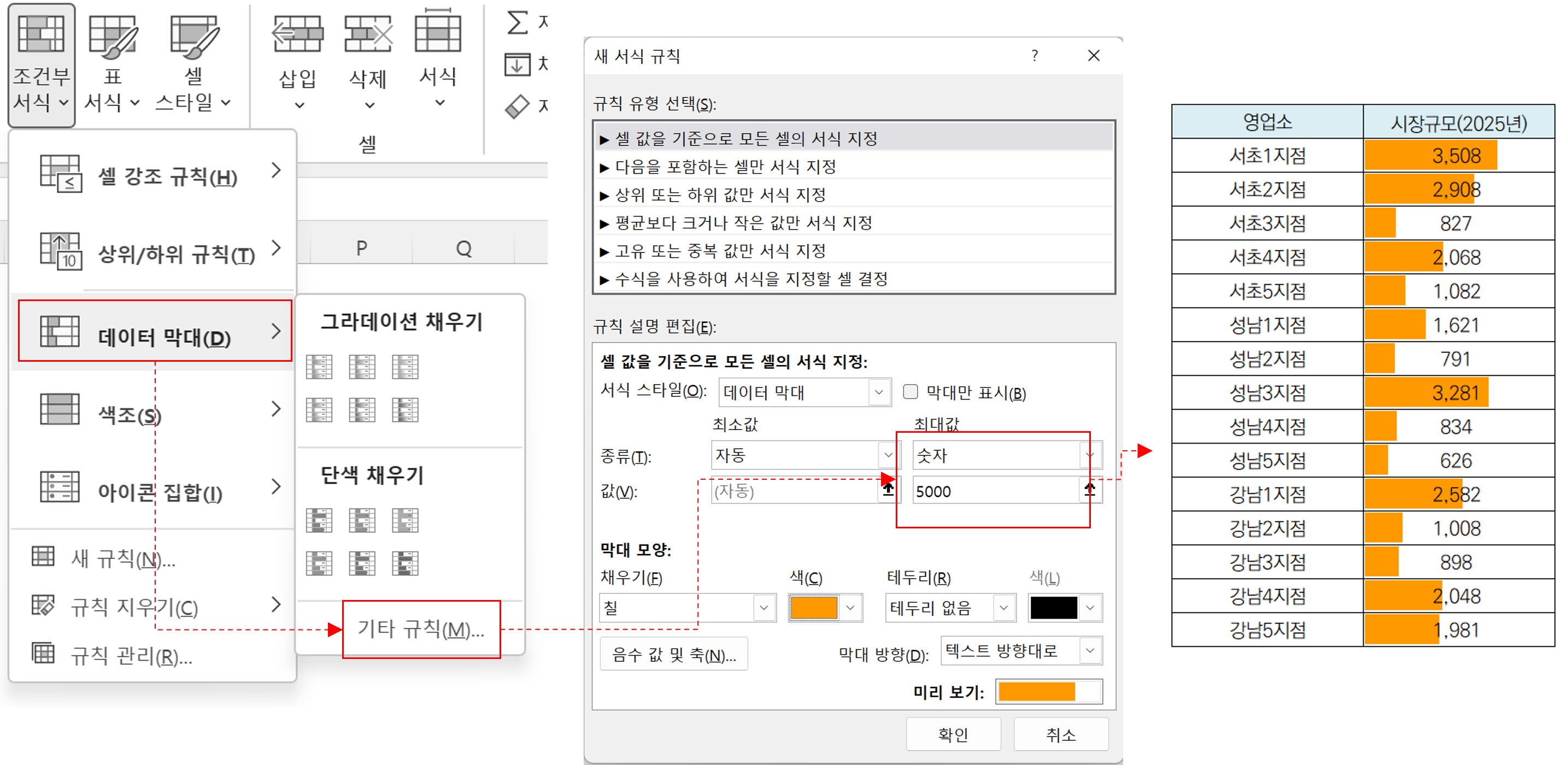 [데이터 막대]에서 [기타 규칙]을 선택하여 내가 원하는 [값]으로 바꾸자.