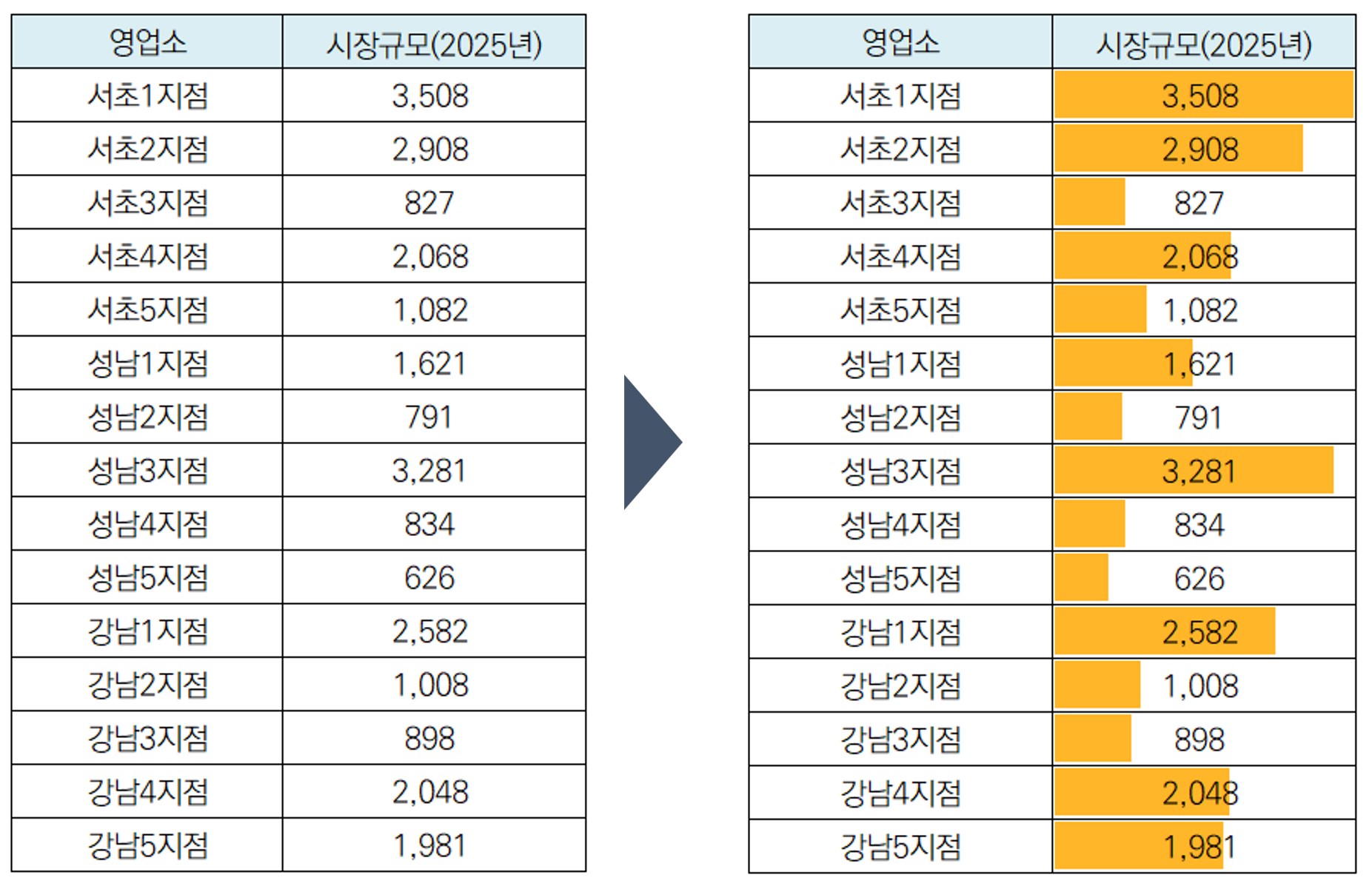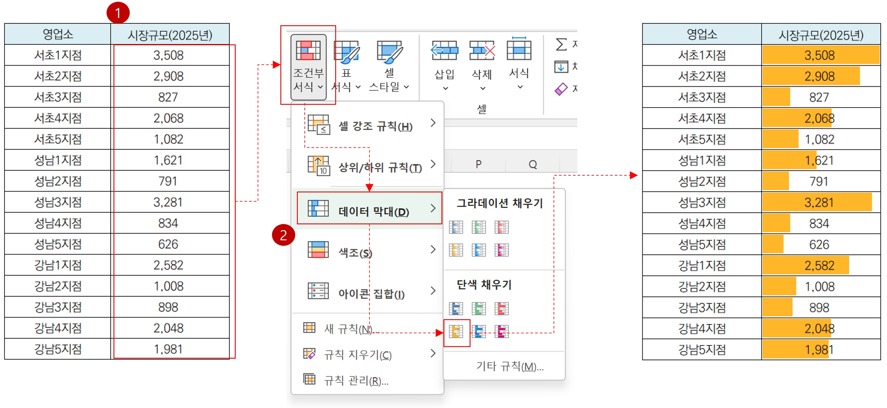 [조건부 서식] 기능 중에 셀안에 수치를 가로 막대로 바꿔주는 기능이 있다. 이 기능을 이용하면 클릭 몇 번이면 아래 왼쪽 테이블을 오른쪽과 같이 바꿔준다.