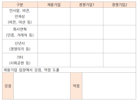 기업의 경영방침에는 CEO의 인사말, 인재상, 신년사 등 기업의 방향성과 관련이 있다. 이러한 방향성을 경쟁기업과 비교하여 채용기업이 가진 강점과 약점을 정리하면 된다.