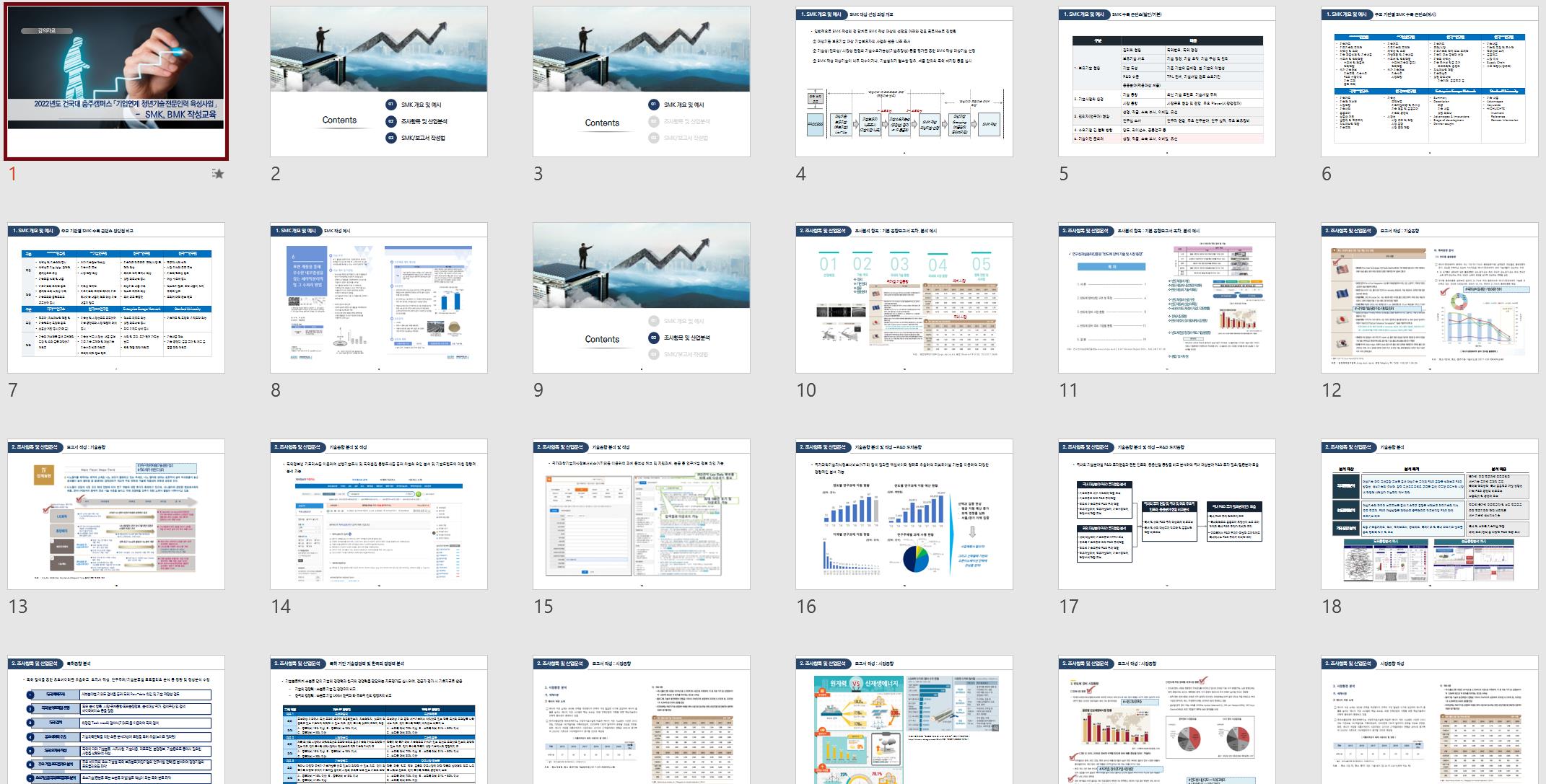 - 연구원의 실무적인 역량 강화를 목적으로 건국대학교 글로컬 기술(특허)를 개별적으로 선택하여 기술이전 활동의 기초자료인 SMK(Sales Material Kit) 작성 방법 강의 및 실습