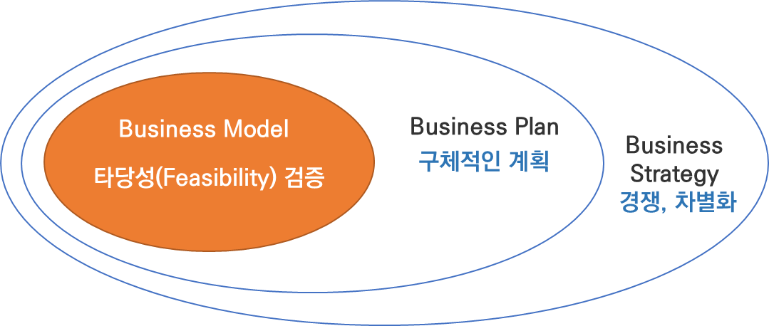 비즈니스 모델 : 사업의 목적, 근거, 구체적인 계획을 다루지 않으며, 사업 검토를 위한 최소의 타당성 검증