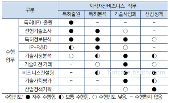 지식재산비즈니스 직무를 4가지로 구분된다고 하였다. 그러나 각 직무별로 수행하는 업무는 다양하다. 예를 들어서 기술사업화 직무는 특허정보분석, 기술시장분석, 기술이전‧거래, 비즈니스컨설팅, 기술가치평가 업무를 주로 수행한다. 산업정책기획, 선행기술조사 등의 업무는 종종 수행하게 된다. 자세한 직무별로 수행업무와 수행 빈도를 아래 표에서 자세히 확인할 수 있다. 기업별로 주력 업무 영역에 따라서 차이가 있다. 이점을 고려하기 바란다.