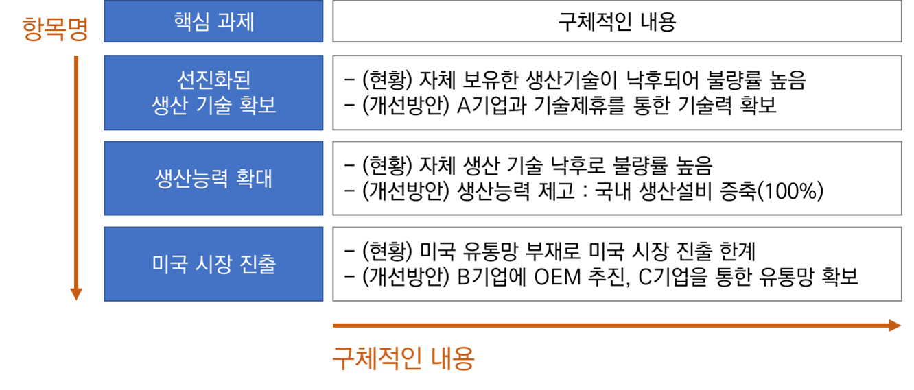 ① 화살표 도형을 넣어 순차적이라는 점을 표현하였다. 이렇게 하니 먼저 생산기술을 확보하고 다음으로 생산설비를 증축한 후 해외시장을 진출하는 흐름을 알 수 있다.
