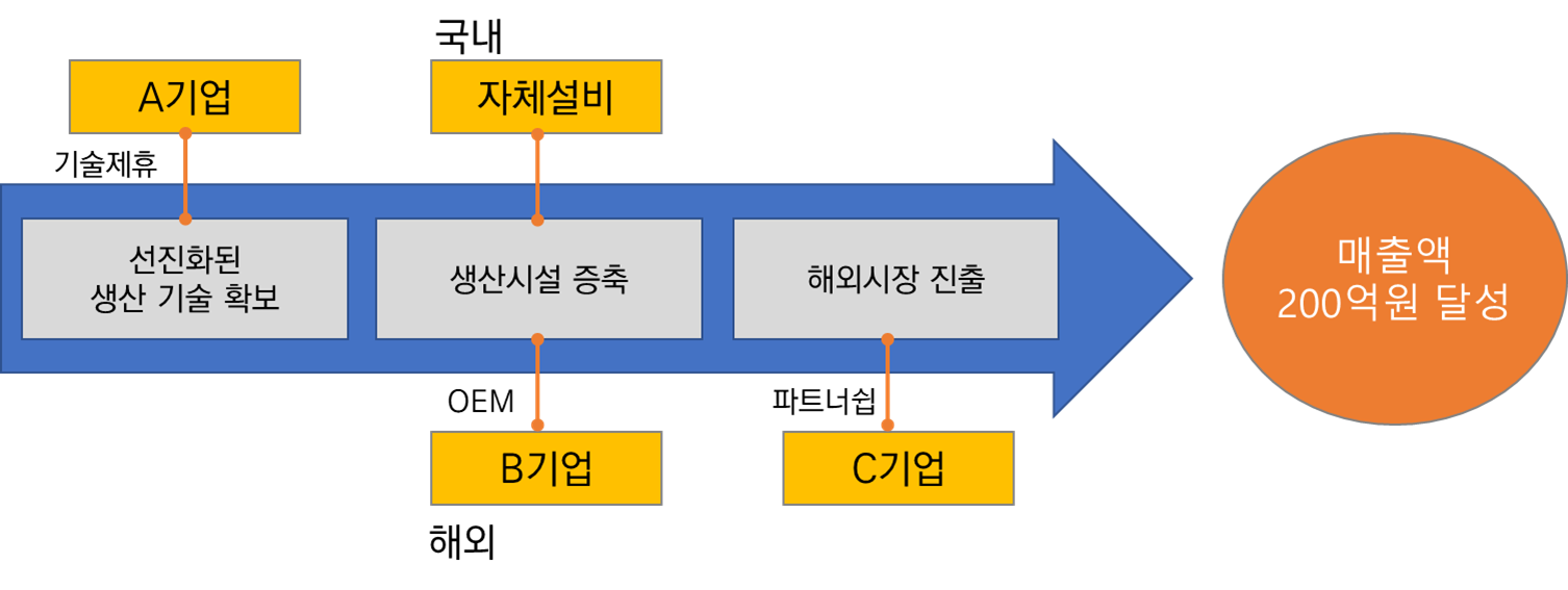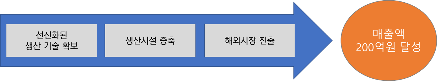 아래 텍스트를 가지고 도식화해보자. 핵심적인 키워드는 진한 볼드체이고 나머지는 부연 설명들이다. 핵심키워드만 뽑아내어 보면 생산기술 확보 → 생산설비 증축 → 해외시장 진출을 통해 최종적으로 매출액 200억원 달성한다는 내용이다.