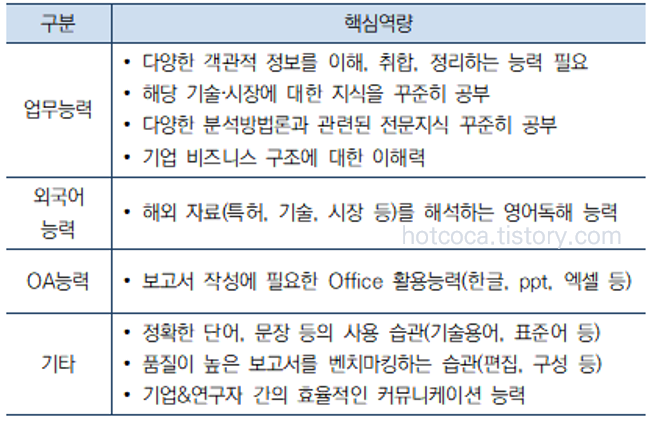 기술이전 및 거래 업무를 위해서는 관련 전공 분야의 배경기술, 자료조사 능력, 보고서 작성을 위한 Office 활용능력 등이 필요하다. 특히, 기술 판매자‧구매자 간의 협상을 위한 커뮤니케이션 능력과 적극적인 자세를 갖추어야 한다.