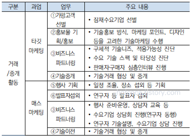 ① 마케팅 기술 선별 : 마케팅 기술에 대한 권리분석, 기술내용 파악, 기술평가 등의 세부 업무 수행