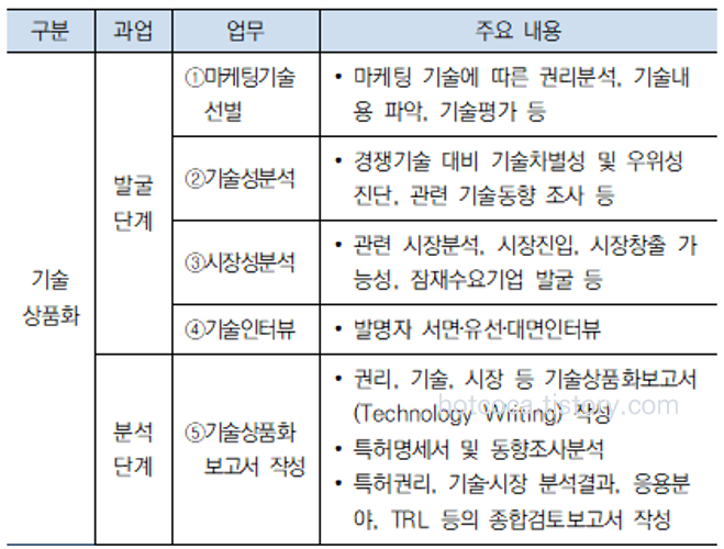 기술상품화 활동은 기술 및 기업 수요를 "발굴단계”와 발굴된 수요에 대한 기술을 분석하는 "분석단계”로 구분할 수 있다. 발굴단계는 기술거래를 위한 기술을 선별하거나, 기업 수요에 적합한 기술을 선별하고, 발명자 인터뷰를 통해 기술의 권리 및 진척도를 파악하고, 해당 기술의 기술성을 분석하고, 기술의 적용 분야에 대한 시장을 분석하는 활동을 수행한다. 분석단계는 앞서 조사된 결과물을 바탕으로 기술수요기업이 대상기술의 가치, 우수성 등을 파악할 수 있도록 표현하여 문서를 작성하는 활동을 말한다.