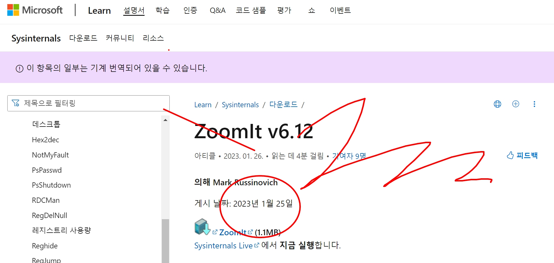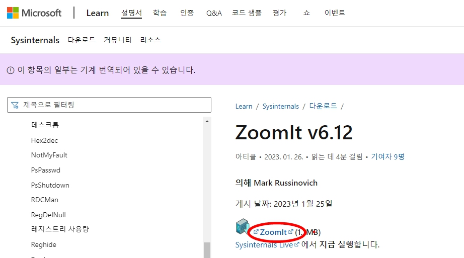 홈페이지를 따라가면 볼드체로 되어있는 "줌잇(ZoomIt)" 을 선택합니다.