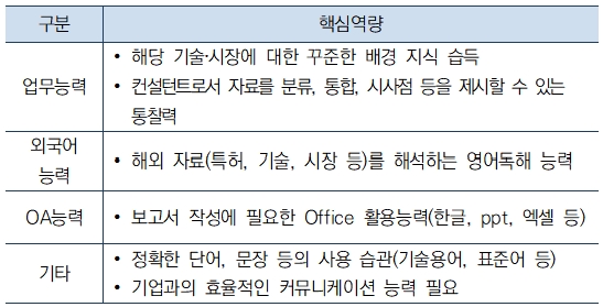 사업전략 컨설팅 업무를 위해서는 관련 객관적 정보를 이해하고 취합하는 능력, 영어독해 능력, 자료조사 능력, 보고서 작성을 위한 Office 활용능력 등이 필요하며, 최신 기술동향, 시장 동향, 조사방법론 등을 습득하는 노력을 게을리 하지 않아야 한다. 특히 기업의 경영진과의 효율적인 커뮤니케이션 능력이 필요하고, 경영학적인 지식을 꾸준히 습득해 나가야 한다.