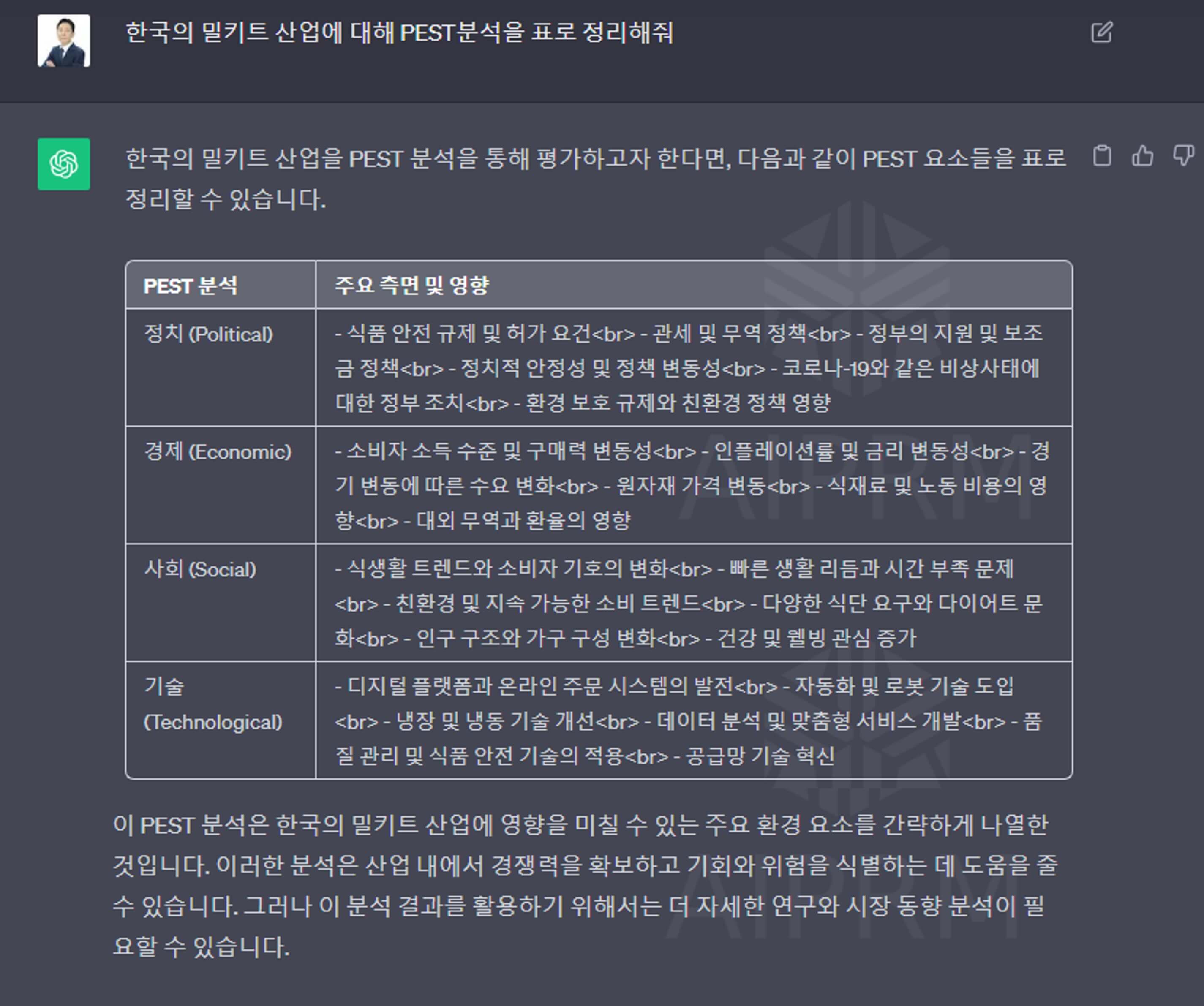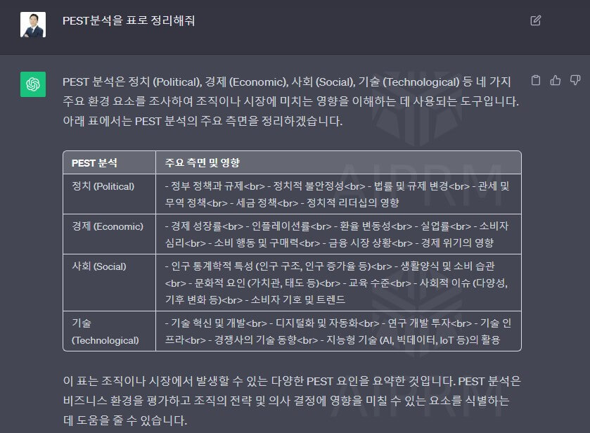 프롬프트로 "PEST분석을 표로 정리해 줘"라고 명령했습니다.