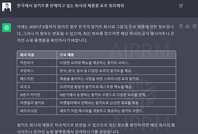 우선, gpt에서 "한국에서 밀키트를 판매하고 있는 회사와 제품을 표로 정리해 줘"라고 물어봅시다.